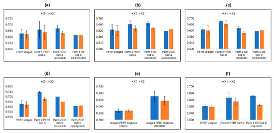 DSC profiles of 2mm polymer discs exposed to different conditions of induced aging. (a) Cell 1A PE-RT exposed to up to 60 °C and 400 barg starting from 10 barg; (b) cell 2A PE-RT exposed to up to 90 °C and 400 barg starting from 50 barg; (c) cell 2B PE-RT exposed to up to 90 °C and 400 barg starting from 200 barg; (d) cell 2C PE-RT exposed to up to 90 °C and 400 barg starting from 100 barg; (e) comparison of virgin and tensiled PE-RT at STP until necking; (f) cell 2D PVDF exposed to up to 90 °C starting from 10 barg. Nomenclature: X1 (blue) is 1st crystallinity cycle; X2 (orange) is 2nd crystallinity cycle; Perm 1 is 1st permeation round at conditions up to 60 °C and 400 barg; Perm 2 is 2nd permeation round at conditions up to 90 °C and 400 barg; OE (exposed) means part of aged specimen exposed to thermal loading but not to pressure loading; OE (unexposed) means part of the aged specimen not exposed to thermal or pressure loadings.