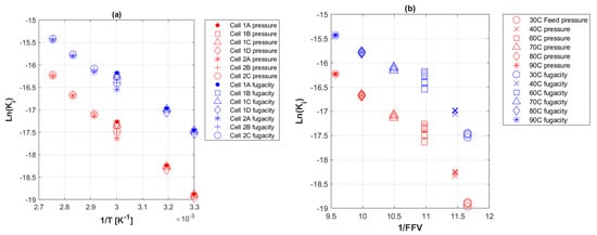 Arrhenius type plots of the permeability coefficient of CO2 to PE-RT permeation cells. (a) Natural log of permeability coefficient against 1/T; (b) natural log of permeability coefficient against 1/FFV.