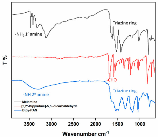 2.2. Synthesis of Porous Organic Polymers Based on Melamine and [2,2′-Bipyridine]-5,5′-Dicarbaldehyde