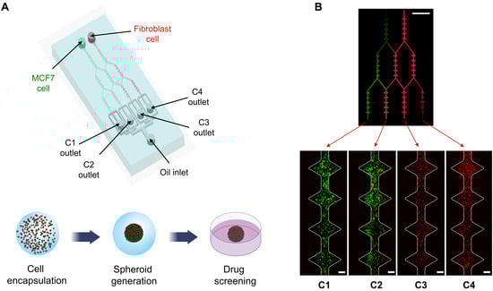 Multicellular spheroids within a droplet formed by the microfluidic gradient device. (A) Encapsulated cell images (MCF-7 and fibroblast cells were stained by CellTrace™ CFSE and CellTrace™ Far Red, respectively). Scale bars are 100 μm. (B) Graph of relative percentage of cells in encapsulated droplet by each outlet.