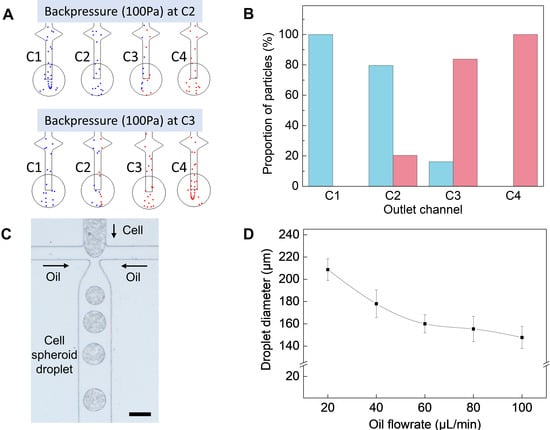 The mechanism of generating the fraction gradient was illustrated via computational simulation (Figure 2A,B). The associated physical concepts for this simulation involved: (1) the migration of the particles due to the drag force generated by laminar flow; (2) back pressure occurring during droplet generation; and (3) fraction gradients based on Y-shaped channels. First, the particle trajectories in a laminar flow were determined by drag force. As can be seen in Equation (2), the drag force is defined as a function of velocity unless the particle size changes. Thus, the particles in a laminar flow were significantly affected by velocity gradients and they migrated from the place with low velocity to the place with high velocity. It can be elucidated that the particles tend to migrate to where a more potent force is applied. Second, the droplet generation generally accompanies back pressure, which supplies the driving force in the opposite direction from the overall flow. Back pressure causes a drop in velocities and generates velocity gradients between the microchannels. We investigated the migration of particles according to where the back pressure occurred (Figure 2A). The blue and red particles were modeled as cell models of a cancer cell (MCF-7) and fibroblast. As aforementioned, since the velocity decreased in the microchannel with the back pressure, the drag force was relatively low. Hence, the particles migrated to the microchannel that didn’t experience back pressure. Third, assuming that the back pressure sporadically occurred between the microchannels and its frequency of occurrence was constant as previously reported [30], the particles were likely to migrate while generating their fraction gradients along the Y-shaped microchannels (Figure 2B). We counted the total amount of particles at each outlet for 5 min and calculated the fractions thereof. The fractions of blue particles were 100%, 83.8%, 20.4%, and 0%, respectively.