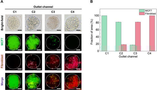 Herein, we used the MCF-7 and NIH-3T3 cell lines for the establishment of tumor spheroids. The MCF-7 cells are hormone-responsive to the breast cancer cell line [31], and NIH-3T3 cells were used in this study as a stromal cell, which can occupy a major portion of the tumor microenvironment [32]. We compared the computational simulation of particle proportion with the actual cell fraction area of homotypic and heterotypic MCTs. We labeled MCF-7 and fibroblast with different fluorescent molecules for the visualization of each cell. The MCF-7 cell line was stained using CFSE CellTrace and the fibroblast cell line (NIH-3T3) was labeled with a Far Red CellTrace to obtain a clear distinction between the two cell populations. Both CellTrace molecules readily diffuse into cells and bind covalently to intracellular amines in proteins resulting in stable and well-retained fluorescent staining [33]. A quantitative analysis measured the color intensity of the green and red fluorescence in Figure 3A, as shown in Figure 3B. The actual cellular fraction area of MCTs collected from each outlet corresponded with the computational simulation result. Therefore, our microfluidic-based droplet system was proven useful for the generation of homotypic and heterotypic MCTs which could form various ratios of fibroblast cells.
