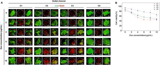 In our work, the MCF-7 and fibroblast cells were directly mixed and generated into multiple types of MCTs—homotypic and heterotypic—in the microfluidic-based gradient droplet system. To validate the generated MCTs for drug-based cytotoxicity screening, the standard chemotherapeutic drug (Dox) was utilized as a model agent. Dox acts by intercalating with the DNA of the cell to inhibit the action of the enzyme topoisomerase II required for supercoil relaxation during transcription [34]. Cytotoxicity results from the inhibition of replication and free radical formation. The cytotoxicity of Dox on multicellular spheroids were evaluated at various dosages, respectively, and the results are shown in Figure 4. The aim of our study is to compare and contrast the difference in cytotoxicity profiles in MCTs, which can contain different cell ratios. Fluorescent microscopic images of MCTs (Figure 4A), treated with an increasing concentration of Dox, were used for end-point cell viability validation using a Live/Dead assay. Two fluorescent dyes are employed to differentiate between live and dead cells, live cells represented by a bright green fluorescence and the nuclei of dead cells represented by a red fluorescence. The results indicated a dose-dependent decrease in cell viability as the cells were treated with increasing concentrations of Dox in MCTs (Figure 4B). Particularly, the cytotoxicity observed in MCTs containing fibroblast cells was markedly less as compared to the MCTs formed with MCF-7 cells only (Figure 4B). Furthermore, MCTs, which could consist only of MCF-7 cells treated with high concentrations of Dox (6 or 8 μg/mL) demonstrated a difference in cell viability between MCTs with fibroblast cells. This suggests that the fibroblast-free MCTs can be more susceptible to drug treatment. This result demonstrated that the presence of NIH-3T3 cells also enhanced the Dox resistance of MCTs at all drug concentrations (2–10 μg/mL). Thus, we confirmed that the cell viability was affected by the cellular ratio, showing that the more stromal cells contained, the more drug resistance increased.