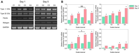 (A) Representative agarose gel showing mRNA expression of ECM-associated genes in MCTs generated from droplet system for days 1 and 5. (B) Quantification of expression of Type Ⅰ and Ⅲ collagen, fibrilin, and nidogen relative to GAPDH from day 1 to day 5. Data are represented as mean ± standard deviation of 3 independent experiments. * indicates p < 0.05 for day 1 vs. day 5, § indicates p < 0.05 for C2 vs. C3 in day 5, and §§§ indicates p < 0.001 for C2 vs. C3 in day 5.