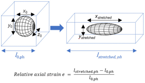 The incorporation of particles of one polymeric material into a phantom matrix made from another polymeric material results in a composite system (Figure 1). If those materials show identical mechanical properties at the condition of deformation, they may be considered as a mechanically homogeneous elastic composite, meaning that the local flow of both polymeric materials (inclusion and phantom) occurs to an identical extent upon deformation. Based on this assumption and further considering the particles as incompressible materials of a constant volume, the stretching of a sphere with initial dimensions x0, y0 and z0 by a factor f in the x-direction should result in simultaneous thinning of the particle diameters in the y- and z-directions, according to Equation (1) (homogeneous composite material model) [26].