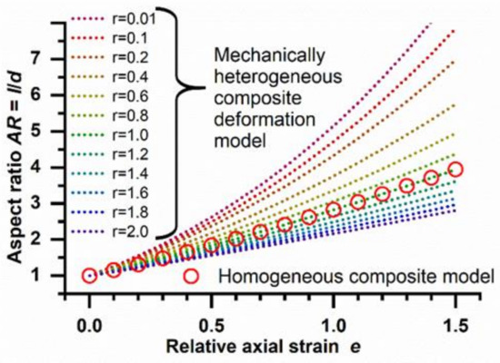 As shown in Figure 2, substantially different deformation patterns can be expected for different combinations of inclusions and matrices when applying the model for heterogeneous composite deformation (Equation (2)). Marked shifts of AR are proposed even upon only slight mismatches of particle and phantom mechanics (e.g., r = 0.8). At r = 1, i.e., identical E moduli of particulate inclusions and phantom matrix, the two models (Equations (1) and (2)) give consistent results of AR dependency on the axial strain.