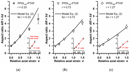 Correlation of experimentally determined AR and predictions of the heterogeneous deformation model according to Equation (2). Data for PPDL-PTHF particles after phantom stretching at different e (open symbols). Curve of the model as calculated based on the applicable r values (Table 1) for the respective PPDL-PTHF material (black lines). Insets: fitting of the model to experimental data up to AR values of ~3. (a) PPDL40-PTHF, (b) PPDL50-PTHF, and (c) PPDL60-PTHF. Mean and S.D. of n ≥ 20 particles for each condition. R2 coefficient of determination from curve fitting.