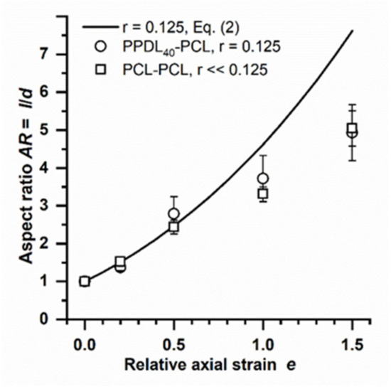 In fact, considering the phase separation of the PPDL-PTHF materials that contain molten (PTHF) and some crystalline domains (PPDL) at Tstretch = 70 °C, at least a certain portion of the particle volume (PPDL crystallites) should not behave as an elastic body during stretching deformation. Again, if the presence of hard PPDL domains caused the deviations from the deformation model, this phenomenon should be strongest at high content (PPDL60-PTHF) rather than at low content of PPDL (PPDL40-PTHF). As the opposite pattern was observed, it was concluded that the behaviour of the soft phase, rather than the hard phase, requires further investigation. Specifically, the authors assumed that the entanglements of polymer chains in the soft domains were the main cause of the restrictions of achievable AR and became effective at a certain AR that may be characteristic for the specific material.