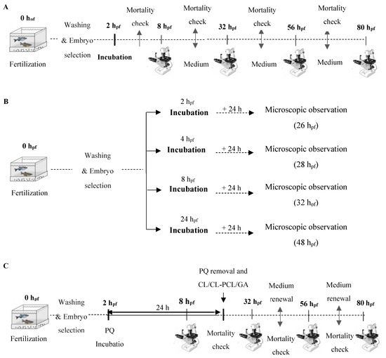 Experimental design of zebrafish embryotoxicity test (FET): (A) long exposure; (B) short exposure; and (C) post-incubation assay. hpf—hours post-fertilization; PQ—paraquat; GA—gallic acid (GA), CL—Curcuma longa extract (CL) and CL-PCL—CL-poly-Ɛ-caprolactone nanoparticles.