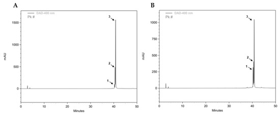 The chemical profile of methanolic CL extract was investigated in order to measure the concentration of total CC and other curcuminoids. The chromatograms of commercial standard curcumin and our CL extract have similar composition (Figure 2). As previously reported [62], based on the spectral data and retention times obtained, the major compounds found were curcumin and, at lower amounts, the curcuminoids bisdemethoxycurcumin and demothoxycurcumin. From the DAD data collected, the CL extract did not show other significant compounds besides these. Our CL extract contains a total of 459 µg/mL of CC and its curcuminoids. For clarity, the HPLC results relating to the period between 38 and 44 min are presented in Supplementary Information (Figure S3).