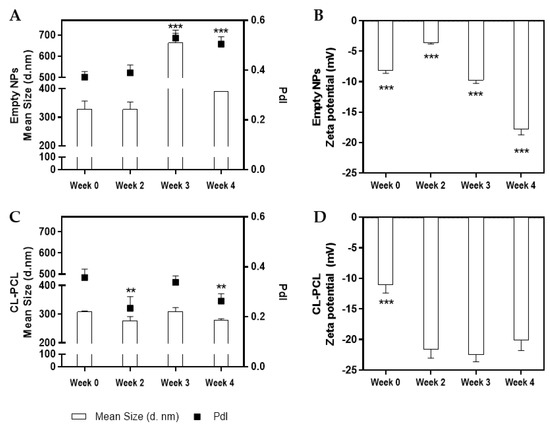 The prepared nanoparticles were characterized in terms of size distribution, PdI, and zeta potential. Analyzing Figure 3, notorious differences were observed between empty and CL-PCL nanoparticles. The former presented higher sizes and PdI values (Figure 3A), with significant variations in long-term (one-way ANOVA, F(3,14) = 106.240, p < 0.001). Furthermore, surface charge of the developed empty nanoparticles showed a significant decrease along time: at day 0, measured zeta potential was −8 mV and, 4 weeks later, −18 mV (Figure 3B) (one-way ANOVA, F(3,14) = 409.630, p < 0.001). Regarding the CL-PCL nanoparticles, it was observed that 4 weeks after production, the nanoformulation presented values of size and PdI of 279 nm and 0.26, respectively (Figure 3C). Additionally, it presented a highly negative surface charge at weeks 2, 3, and 4 (>20 mV) (Figure 3D). Significant differences were found in the size and PdI value at weeks 2 and 4 (one-way ANOVA, size: F(3,12) = 10.890, p < 0.01; PdI value: F(3,12) = 11.400, p < 0.01), and in the zeta potential at week 0 (one-way ANOVA, F(3,12) = 57.770, p < 0.001).