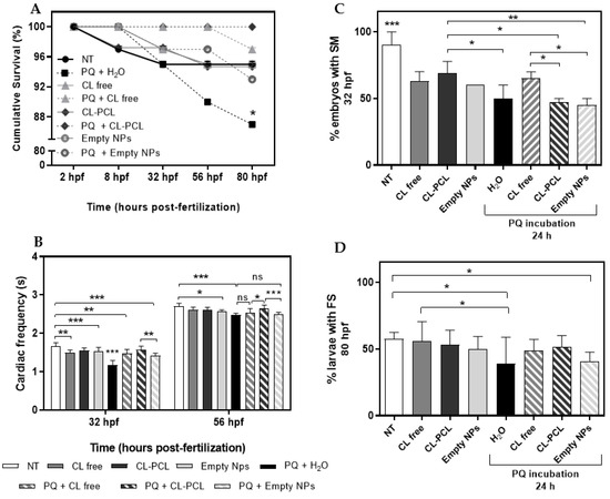 The effects of 24 h insult of paraquat (PQ) followed by a long exposure of Curcuma longa extract (CL) Free and encapsulated (CL-PCL) on (A) cumulative survival at 8, 32, 56 to and 80 h post-fertilization (hpf); (B) cardiac frequency (s) at 32 and 56 hpf; (C) spontaneous movements (SM) at 32 hpf, and (D) free swimming (FS) at 80 hpf of zebrafish embryos. At 2 hpf, the embryos were first exposed for 24 h to 0.64 µg/mL of PQ, followed by an insult of 5 µg/mL of CL free, CL-PCL and empty NPs. CL (free and formulated) reduced the mortality rate. Furthermore, the treatment with CL Free and CL-PCL increased not only the heart frequency of zebrafish embryos exposed to PQ but also increased the number of embryos with SM and the larvae with FS behavior. Results are expressed as mean ± SD. ns—not statistically different, * p < 0.05; ** p < 0.01; *** p < 0.001; one-way ANOVA, followed by Newman–Keuls and Fisher LSD post hoc tests.