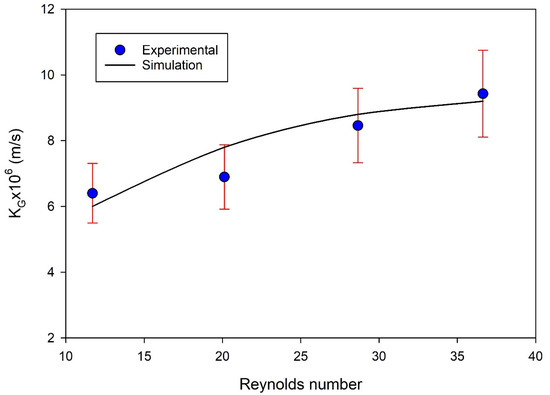 The model predictions were validated using experimental data available from the literature [35]. The model validation was performed by comparing the overall mass transfer coefficient between the experimental data and simulation predictions. As per the experimental data used in the model validation, the gas stream was fed to the lumen side and the solvent to the shell side (Figure 1a). Figure 2 shows the effect of the feed flow rate represented by the Reynolds number on the overall mass transfer coefficient (KG). The results revealed that the mass transfer coefficient increased with an increased Reynolds number, a common trend of the membrane contactors that is attributed to the increase in gas velocity being associated with a decrease in the boundary layer thickness. This replicates the presence of supplementary mixing in the gas phase boundary layer, as the oscillating flow disrupts the thickness of the boundary layer and the flow regime around this layer [36]. The model predictions revealed that increasing the gas velocity had significant effects on the total gas mass transfer coefficients owing to the formation of a thin film for mass transfer layer at higher speeds, which resulted in increases in the mass transfer coefficient of the gas phase layer in spite of decreasing the residence time of the gas inside the membrane module at high velocities. Increase in the velocity has insignificant impact on the overall mass transfer coefficient [37].