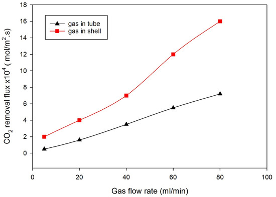 Computational fluid dynamics (CFD) and the design of experiments were performed on a membrane distillation. Simulation results revealed that the membrane module’s length strongly impacts the flux [16]. Mathematical modeling was performed for membrane contactors for CO2 absorption in different solvents. Various solvents were used in the CO2 absorption process, such as 4-diethylamino-e-butanol (DEAB), diethanolamine (DEA), and methyl diethanolamine (MDEA) in hollow fiber modules. DEAB absorption rate was competitive with MEA aqueous solutions [17]. The gas velocity in membrane gas absorption plays a significant role in improving separation performance, and the addition of baffles improves SO2 absorption performance at the critical velocity [18].