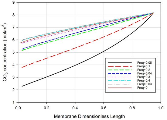 The gas feed velocity coefficient at different employed sinusoidal frequencies was investigated. As absorption occurred in a gas-liquid membrane system that was stabilized very rapidly, a time range of 60 s was investigated [35]. The frequency range was maintained while increasing the speed gradually and reaching the maximum point in 60 s. For example, at a frequency of 0.03, the gas speed gradually increased until it reached its maximum value. Frequencies (other than 0.05) cause the velocity to reach the maximum speed more than once in an oscillatory manner within the studied range. Under sinusoidal operating conditions, the velocity of the feed gas at different frequencies is described in Figure 4. The figure shows the effect of the feed gas sinusoidal frequency on CO2 concentration along the shell side of the membrane unit. The lowest exit CO2 concentration profile was at a frequency of 0.05 HZ. A smaller CO2 concentration in the exit stream indicates a higher percentage removal of CO2 from the gas stream mixture [35].