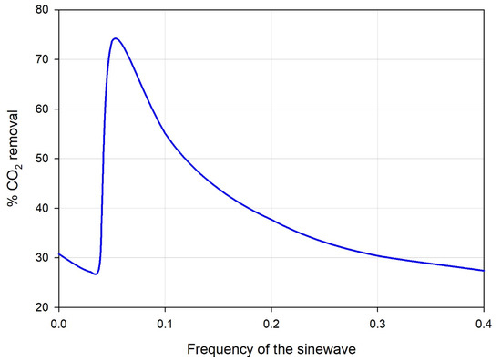 Effect of the sinewave frequency in the feed stream on the percent removal of carbon dioxide from the natural gas stream. The liquid feed rate is 10 mL/min; the gas feed rate is 500 mL/min.