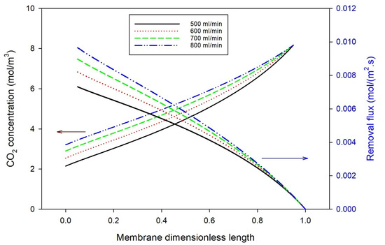 Figure 6 shows the model predictions for the effect of a feed gas flow rate at a constant sinusoidal frequency of 0.05 on CO2 concentrations and removal flux along the dimensionless membrane length. The figure shows that, along the membrane dimensionless length, the higher the gas flow rate, the lower the CO2 removal rate, and the higher the CO2 removal flux. This is attributed to the fact that an increase in the gas flow rate usually reduces the thickness of the gas boundary layer, which is supposed to enhance the mass transfer rate and increase the CO2 removal ratio. At the same time, an increase in the feed gas flow rate reduces the residence time, which reduces the rate of mass transfer, and thus, reduces the rate of CO2 absorption along with the membrane gas-phase compartment (membrane unit envelope side). Similar results were reported in previous studies [38,39,40]. This indicates that the residence time strongly impacts the CO2 removal rate. The increase in the CO2 removal flux with the gas flow rate is credited to the increased amount of CO2 being absorbed with the gas flow rate. Accordingly, residence time strongly affects CO2 removal compared with gas mass transfer intensification.