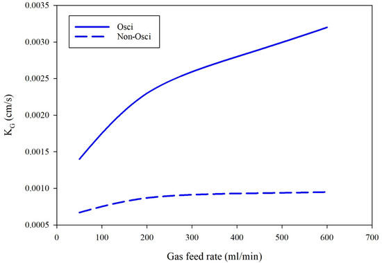 Figure 7 indicates the influence of the gas feed rate on the total mass transfer coefficients under the presence (0.05 sinusoidal frequency) and absence of feed oscillation. The total mass transfer coefficient increased with the gas feed rate due to the amount of carbon dioxide absorbed, and the thickness of the gas boundary layer decreased with the increase in gas velocity. The total mass transfer coefficients increase with the increase in gas velocity mentioned earlier. The results are within the range of those obtained experimentally. In contrast, the effect of gas supply rate on the total mass transfer coefficient in the absence of gas supply disturbance in the sine waveform is negligible. There is a significant increase in KG compared with the non-oscillating mode of operation. The oscillating flow disturbed the boundary layer thickness and flow regime around the layer, causing further mixing in the gas phase boundary layer, and hence, enhancing the CO2 diffusion rate to the absorbing solvent.