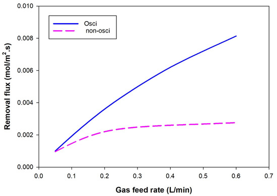 Figure 8 compares the CO2 removal flux between the oscillatory and non-oscillatory gas feed velocity represented by the gas feed rate. The figure shows that the removal percentage increased slightly in the non-oscillating operating mode at a gas feed rate up to a flow rate of 0.25 L/min. Beyond this, the change in the removal ratio with the gas feed rate was insignificant. In contrast, under oscillating mode, a considerable increase in the mass transfer coefficient was observed, indicating the success of the feed gas oscillation mode of operation.