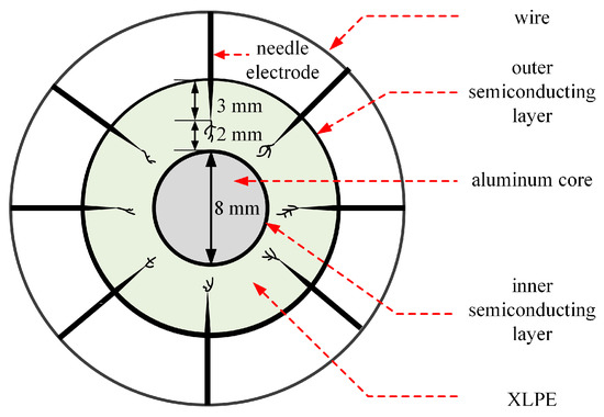 The cable was cut into 1 cm thick slices to study the capacitance change of the cable containing electrical trees. The structure of the sample is shown in Figure 1. The prepared slices and needle electrodes were placed in an oven, where the temperature was controlled at 80 °C for 20 h to eliminate the residual stress. Then, eight needle electrodes were inserted into samples with the same interval, leaving a 2 mm distance between the needle tip and the inner semiconducting layer. The curvature radius of needle tip was 3 μm ± 0.5 μm. Needle electrodes were welded together with wires to prevent the effects of stray capacitance.