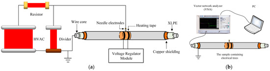The test platform for the electrical tree in the 20 m long cable is shown in Figure 2a. Needle electrodes were inserted into the cable to generate an electrical tree. The heating tape was tied to the cable near the needle electrode. A voltage of 50 Hz, 10 kV RMS was applied to the needle electrodes to initiate electrical trees and the wire core of the cable was grounded. The applied voltage was maintained every 10 min and then removed. Then, the heating tape was turned off and cooled at room temperature for 30 min.