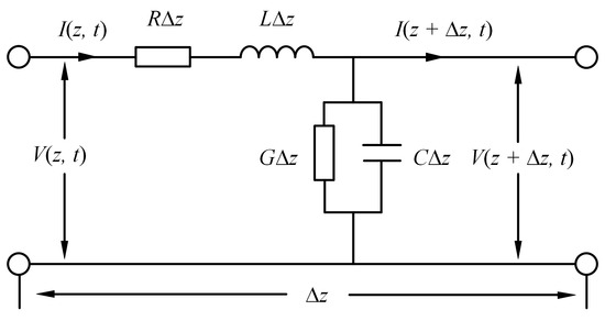 According to the transmission line theory, when the cable length is greater than one-tenth of the signal wavelength in the BIS test, the distributed parameter model is needed to replace the lumped parameter model. Figure 3 shows the equivalent circuit of the ∆z-length transmission line. Distributed parameters R, L, G, and C represent resistance, inductance, conductance, and capacitance of unit length, respectively. ∆z is the length of the unit transmission line, which is far shorter than the signal wavelength. The cable can be regarded as a series of ∆z-length transmission lines.