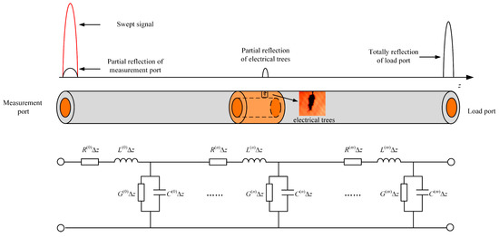 The current research on diagnosing and locating electrical trees is mostly based on the measurement of the partial discharge (PD) signal. Electrical trees can be located and classified through the time–frequency domain characteristics of PD pulses [11,12,13,14]. Furthermore, some scholars have established multi-dimensional analytical models of PD signals, and intelligent algorithms such as neural networks have been adopted to identify the tree growth process [15,16]. These methods can locate electrical trees in short cable samples. However, PD signals in long cables are difficult to identify due to attenuation and dispersion at high frequencies. At the same time, high voltage is required to generate PD during testing, which may cause secondary damage to the insulation. Therefore, non-destructive location methods for electrical trees in long cables need to be proposed.