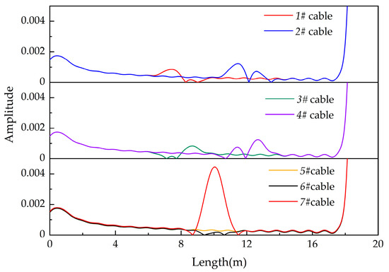 Figure 6 shows the location spectra of different simulated cables. It can be found that when the capacitance changes locally in the cable, there are two reflected peaks at the degradation location. In contrast, there is only one reflected peak at the degradation location when the conductance changes in the cable. Here, 1# and 2# simulate cables with local reduction of capacitance. The location spectra of 1# and 2# show the same changing trend. The amplitude of the first reflected peak in the location spectra are larger than that of the second one. At the same time, the peaks of two reflected peaks of 2# are larger than those of 1# cable because a bigger capacitance change exists in 2#. In this study, 3# and 4# simulate cables with a local increase of capacitance. The peak of the first reflected peak is smaller than that of the second one in both location spectra of 3# and 4#. The amplitude of reflected peaks in 4# with a bigger capacitance change is higher than that of 3#. Here, 5#, 6#, and 7# simulate cables with a local increase of conductance. The location spectrum of 5# changes slightly, while the location spectrum of 6# cable has a reflected peak with a small amplitude at the degradation location and the reflected peak in 7# has a larger amplitude. It should be noted that when the distributed parameters change slightly, the reflected peak value at the change point may be smaller than the amplitude without change (1#, 3#, 5#, and 6#). When the amplitude of the reflected peak is too small, the peak may be confused with the noise signal, which affects the identification of the reflected signal.