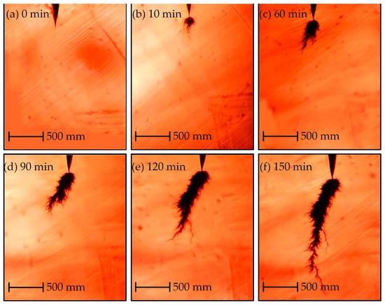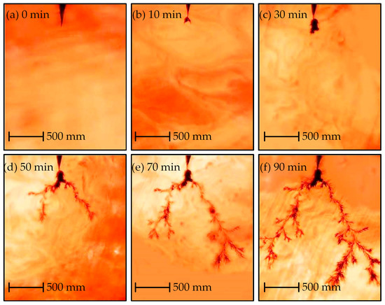 Figure 7 shows an electrical tree grown in the sliced sample at 30 °C. The shape of the tree at 30 °C can be characterized as a branch-pine tree. The electrical tree grows slowly for 30 min after initiation (Figure 7a–c), and then the pine structure develops from the main channel outwards (Figure 7d–f). The growth rate of pine structure is faster, and its color is lighter. The branch-pine tree grows to breakdown after 90 min. The growth process of the electrical tree in the sample at 70 °C is shown in Figure 8. The shape can be characterized as representative of a bush-pine tree. The tree structure is denser and in a deeper color. The bush-pine tree grows slowly for 60 min after initiation (Figure 8a–c) and then the tree develops to breakdown after 150 min. The growth rate of trees grown at 70 °C is slower than those grown at 30 °C.