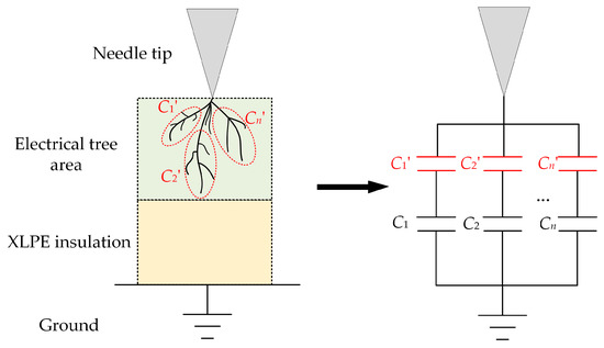 Figure 10 shows the model of distributed parameters during the growth of electrical trees. The electrical tree can be regarded as parallel to n channels [27]. Cn′ represents the capacitance between needle tip and the nth channel end. Cn is the capacitance between the channel end and the ground. The channels of the electrical tree can be divided into two types: conductive and non-conductive. There are a lot of conductive carbonized materials existing in the conductive channels. On the contrary, there are none or only a small amount of conductive materials inside in the non-conductive channels [28]. Therefore, when the non-conductive channel grows, the composition of the channel is mainly the air gap with a smaller relative dielectric constant. When the non-conductive tree grows, Cn′ will continuously decrease. The capacitance between the needle tip and the ground electrode can be regarded as a series of capacitances. When Cn′ decreases, the overall capacitance of the sample will also decrease. The experimental result in Figure 9 is consistent with this.