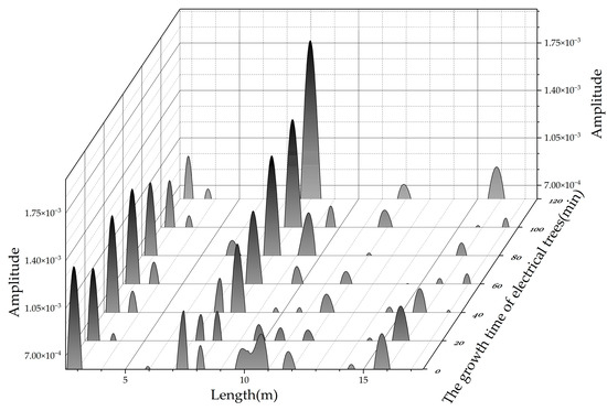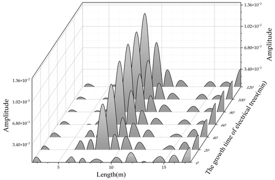 Figure 13 shows the location spectrum of the 20 m cable containing a bush-pine tree at different growth times. The location of the electrical tree is 9.3 m. With the increasing tree growth time, two reflected peaks with large amplitude appear in the location spectrum. When the electrical tree grows for 20 min, the peak values are 7.68 × 10−3 and 3.04 × 10−3, respectively. Then, the peak values rise to 1.07 × 10−2 and 6.04 × 10−3 when the tree grows for 60 min. When the electrical tree grows for 120 min, the peak values reach 1.28 × 10−2 and 7.64 × 10−3.