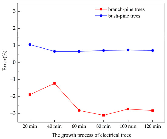 where ls is the degradation location in the location spectrum, lm is the measured actual degradation location, l is the length of the tested cable. The location error of the location spectrum for different types of electrical trees is shown in Figure 14. It can be found that the locating error of locating the branch-pine tree is larger and the error is negative during the growth of the electrical tree.
