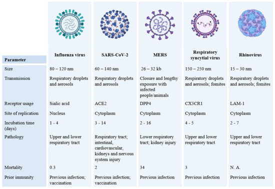 Microbiologic and epidemiologic comparisons between influenza virus, SARS-CoV-2, Middle East Respiratory Syndrome (MERS), RSV and Rhinovirus [41,42]. Adapted from “Epidemiological Comparison of Respiratory Viral Infections”, by BioRender.com (Accessed: 18/02/2022). Retrieved from [43].