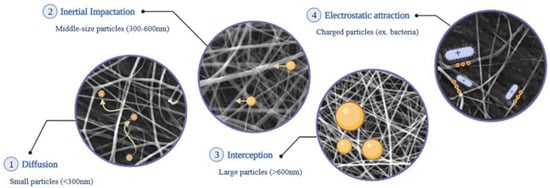The effectiveness of filtration capacity is also related to the intrinsic characteristics of electrospun nanofibers. These characteristics are the orientation of nanofibers adopted, as well as the thickness of the membrane, the size of the pores, and the fibers’ diameter. The random orientation in which nanofibers are deposited in a conventional collector during the electrospinning process is an advantage considering the haphazard trajectory of particles that limit its penetration. Furthermore, electrospun meshes with reduced fiber diameters and high thickness usually result in membranes with improved filtration capacity, since a high volume is required for the particle to cross it. Furthermore, the smaller the size of pores in the membrane is, the higher capacity for particle retention, since it will require bigger pores to pass through [51].