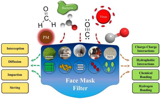 The application of biopolymers in the biomedical field is extensively reported; however, in recent years, biopolymers have received increasing attention for producing efficient filters, owing to the presence of functional groups, which allow them to possess characteristics such as antibacterial and antiviral properties [80,81,82,83,84,85]. The diverse functional groups that protein- and polysaccharides-based polymers embrace permit them to have different methods of interactions with particles or contaminants [80]. The major biopolymers used for filtering applications are chitosan/chitin, soy protein, silk protein, gelatin, cellulose, keratin, starch, and alginate [80,81,82,83,86] (Figure 5). The principle by which those biopolymers act as filter agents are based on two different approaches: adsorption, where the contaminants are trapped in the filter surface, and the other, chemisorption, where the filter’s components, such as the active sites of biopolymers or metallic particles, react with the contaminant, making them inert. Besides the chemisorption by electrostatic interactions, biopolymers can inert contaminants by inertial impaction, interception, and diffusion as synthetic polymers [80].