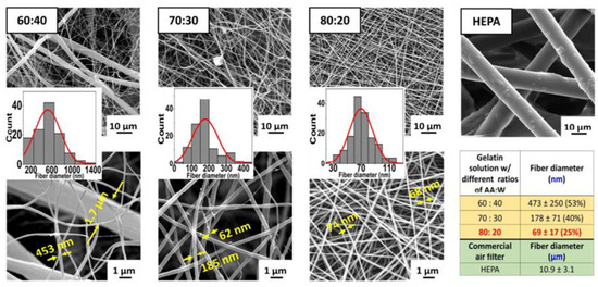 Scanning electron microscopy (SEM) images of gelatin fibers produced with different rations of Acetic Acid-to-water on fibers’ morphology and their filtration capacity, compared to commercial HEPA filter. Reproduced with permission from [90].