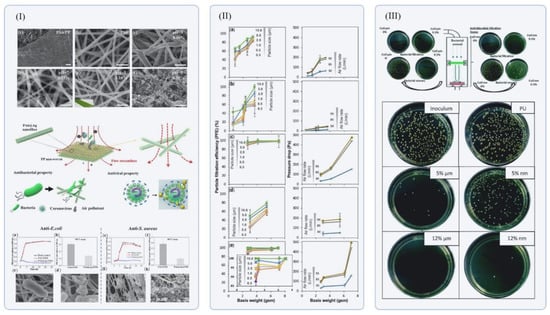 (I) Schematics showing antibacterial activity against E. coli (a,b) and the morphology (c,d) of these bacteria on PA6 electrospun nanofibers without and with Ag NPs, respectively; as well as the results obtained regarding their antibacterial activity against S. aureus (e,f) and the morphology (c,d) of these bacteria on PA6 nanofibers without and with Ag NPs (g,h), respectively. Adapted with permission from [48]. (II) Evaluation of electrospun nanofibers on particle filtration efficiency of (a) PAN, (b) PAN/PVDF, (c) PAN/PVDF/GM, (d) PAN/PVDF/Ag and (e) PAN/PVDF/GM/Ag. Adapted with permission from [98]. (III) Schematic representation of antibacterial activity evaluation of polyurethane nanofibers incorporating CuO NPs against Staphylococcus gallinarum. Adapted with permission from [97].