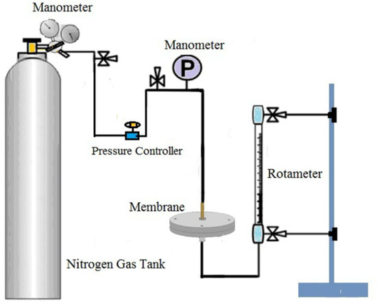 Nitrogen flux of dry ultrafine fibrous FEP porous membranes was measured by a laboratory device (Figure 3) by the following Equation (2), and the permeate flow rate was measured at a pressure of 0.1 MPa.