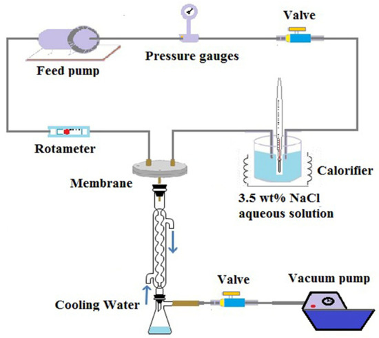 Experiments on Vacuum Membrane Distillation (VMD) were carried out to evaluate the permeate performance of ultrafine fibrous FEP porous membranes. The desalination experiment was performed using a setup schematically shown in Figure 4. One side of the membrane was in contact with a hot, circulating salt solution, and its other side was connected to a vacuum pump to withdraw the permeated water vapor. The water vapor was subsequently condensed into liquid water by a glass condenser using tap water as coolant. The condensed water was collected in a glass bottle, and its volume was determined with a measuring cylinder. The conductivity of the feed solution and permeate water was measured by a conductivity meter (AP-2, HM). The NaCl rejection R was calculated by the following Equation (4):