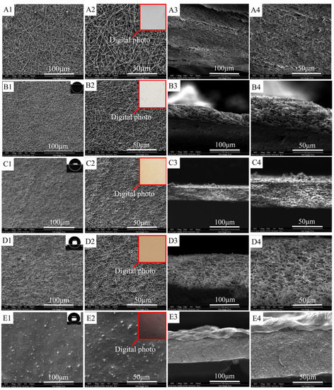 Morphologies of ultrafine fibrous FEP porous membranes at different sintering temperature (FEP/PVA mass ratio 1:6; (A): nascent membrane; (B): 260 °C; (C): 280 °C; (D): 300 °C; (E): 320 °C; 1: 1000× surface; 2: 2000× surface; 3: 1000× cross-section; 4: 2000× cross-section).