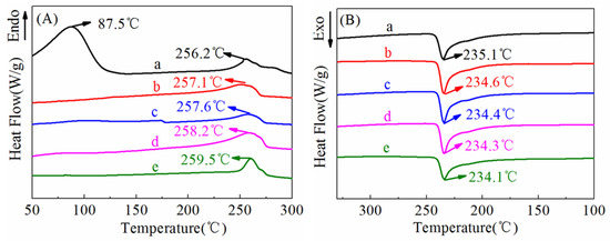 DSC curves of ultrafine fibrous FEP porous membranes at different sintering temperature (FEP/PVA mass ratio: 1:6; a: nascent membrane; b: 260 °C; c: 280 °C; d: 300 °C; e: 320 °C; (A)-heating curve, (B)-cooling curve).