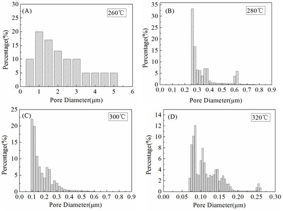 Pore size distribution of the ultrafine fibrous FEP porous membranes at different sintering temperature (FEP/PVA mass ratio: 1:6). (A) 260 °C; (B) 280 °C; (C) 300 °C; (D) 320 °C