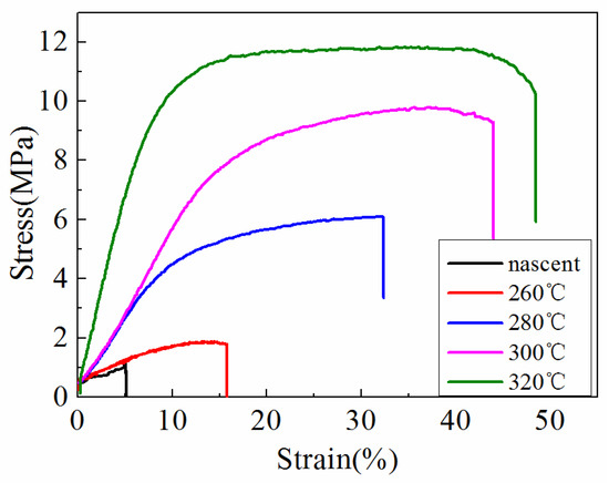 Figure 9 shows the stress–strain curves of the ultrafine fibrous FEP porous membranes. It can be seen that the mechanical properties of the membrane samples improved significantly after sintering. These results can be explained by the structural and compositional changes at different sintering temperature. The nascent membranes were formed by multiple layers of randomly oriented composite ultrafine fibers of FEP particles in PVA matrix. However, the microstructure changed, and the FEP particles were almost completely fused when the sintering temperature was up to 320 °C. These results suggest that the changes in the microstructure observed at 260 °C was due to the melting of FEP particles, and furthermore, it also suggests that the increase in tensile strength of the ultrafine fibrous FEP porous membranes was related to the melting of FEP particles. All the changes are shown in the SEM images (Figure 6).