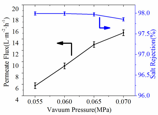 Effect of vacuum pressure on the permeate flux and salt rejection (NaCl concentration, 3.5 wt.%; feed temperature, 80 °C).
