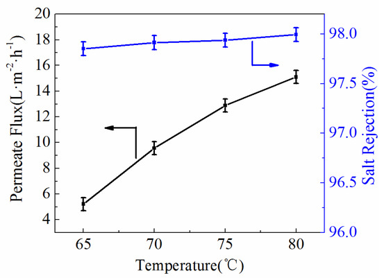 Meanwhile, the effects of feed temperature are exhibited in Figure 11 with the feed temperature heated from 65 °C to 80 °C at the inlet of the membrane module. As the feed temperature increased, there was enhancement of the permeate flux in all ultrafine fibrous FEP porous membranes. It was attributed to the effect of increased feed temperature, which resulted in more mass transfer. The salt rejections of the samples also achieved 97.93%.