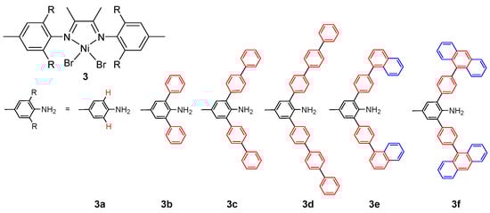 α-diimine nickel catalysts 3a–f with a bi-directional steric environment on the axial sites of the active species.