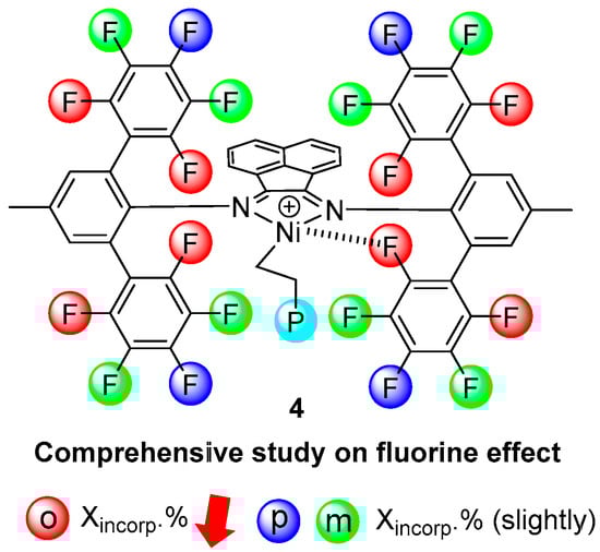 The fluorinated α-diimine Ni(II) catalysts 4 (in the copolymerization of ethylene with polar monomer, the ortho-F substituent is definitely unfavorable for the incorporation, and both the meta-F substituent and the para-F substituent show a slight influence in terms of incorporation).