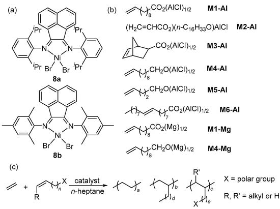 (a) Nickel catalysts 8a,b for olefin copolymerization; (b) different metal–salt-based polar monomers; (c) ethylene copolymerization with polar monomers.