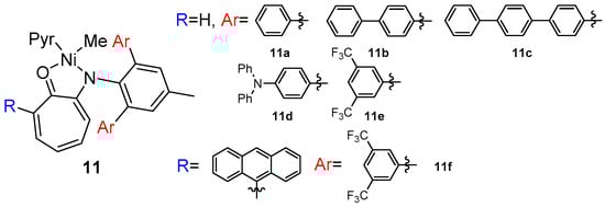 Anilinotropone ligand, as the isomer of the notable salicylaldimine type, was also used in the synthesis of neutral, single-component Ni(II) catalysts 11a–f (Figure 9). Compared with the classic salicylaldiminato nickel catalyst, this isomer catalyst 11f gave 4.5-times higher TOF (5.61 × 103 h−1), 34-times higher MW (Mw = 23.7 × 104 g mol−1), and 1.6-times higher comonomer incorporation (XM = 0.25 mol%) in the copolymerization of ethylene and HAc, thus enabling the formation of high-MW functionalized polyethylene [94]. Mechanistic insights further revealed both the suppression of chain transfer and promotion of chain propagation.