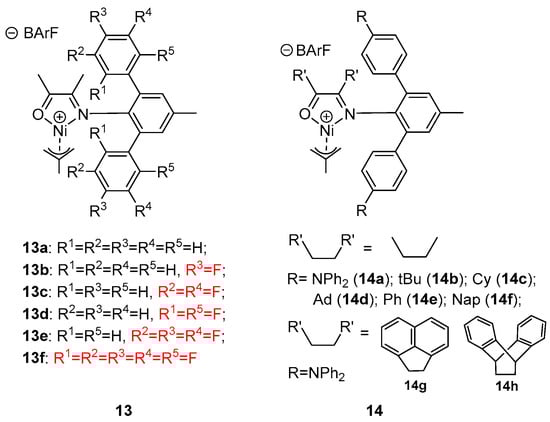 Jian et al. further introduced fluorine atoms with different sites and numbers into above cationic α-ketiminato nickel catalysts to investigate the fluorine effect on ethylene (co)polymerization properties (Figure 11, 13a–f). Notably, the ortho-fluorinated nickel catalyst 13c showed activity and enabled the incorporation of comonomer (0.9 mol%) in E/MA copolymerization, at the same time exhibiting better copolymerization behaviors with long-chain polar monomers [95]. They also introduced different backbones and flexible and rigid axial substituents into the α-imino-ketone framework 14a–h (Figure 11), and the preferred nickel catalyst 14a exhibited high activity of 175 kg mol−1 h−1 to produce functionalized polyethylene with a molecular weight of 13.4 kg mol−1 and comonomer incorporation of 2.9 mol% in E-UCOOMe copolymerization [96].
